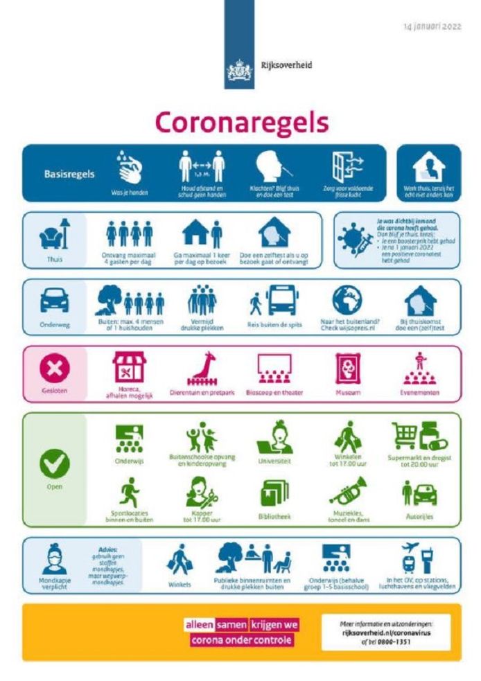 14 januari 2022 1124 14-01-22 1124 Laatste update. Vanaf zondag 0500 uur gelden nieuwe strengere maatregelen tegen het coronavirus. Nederland gaat weer op slot.